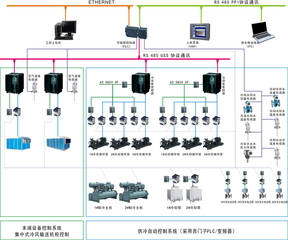 系統(tǒng)采用一套SIEMENS S7-200 PLC(CPU 226、EM235、EM222)分別控制對(duì)應(yīng)的制冷主機(jī)、冷凍水泵組、冷卻水泵組、冷卻塔、閥門等。與變頻器之間采用SIEMENS RS485/USS協(xié)議通訊,與HMI采用SIEMENS RS485/PPI協(xié)議通訊。同時(shí)系統(tǒng)可根據(jù)需求增設(shè)工業(yè)以太網(wǎng)接口或BA接口,工業(yè)以太網(wǎng)接口方便集中監(jiān)控計(jì)算機(jī)與PLC通訊進(jìn)行遠(yuǎn)程監(jiān)控,預(yù)留的BA接口方便與樓宇自控系統(tǒng)(DDC)連接。
