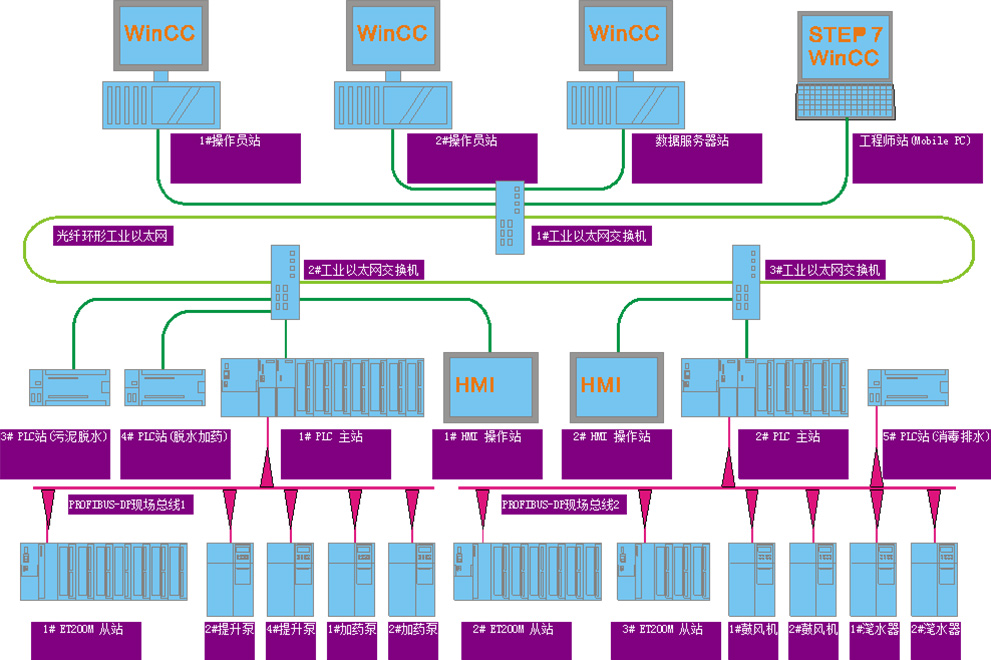 一期工程全廠自動(dòng)化(設(shè)備)監(jiān)控系統(tǒng)由系統(tǒng)監(jiān)控層(監(jiān)控計(jì)算機(jī)操作站、數(shù)據(jù)服務(wù)器、工程師維護(hù)計(jì)算機(jī)站等)、現(xiàn)場(chǎng)控制層(PLC控制柜、分布式IO柜、現(xiàn)場(chǎng)儀表等)、現(xiàn)場(chǎng)設(shè)備層(各種設(shè)備的現(xiàn)場(chǎng)操作柜、啟動(dòng)柜、變頻柜等)組成。系統(tǒng)監(jiān)控層與現(xiàn)場(chǎng)控制層之間采用工業(yè)以太環(huán)網(wǎng)通訊(TCP/IP協(xié)議),現(xiàn)場(chǎng)控制層PLC主站(S7-300 315-2DP)與分布式IO(ET200M)從站、S7-200PLC分站及變頻器子站之間采用PROFIBUS總線通訊(PROFIBUS-DP協(xié)議)。