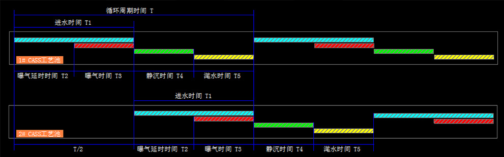 進(jìn)水時(shí)間T1(雙池自動(dòng)運(yùn)行時(shí)不可設(shè)定時(shí)間,系統(tǒng)自動(dòng)計(jì)算)=循環(huán)周期時(shí)間T(根據(jù)工藝要求可設(shè)定)÷2(例如1#CASS工藝池在進(jìn)水/曝氣階段時(shí)2#CASS工藝池進(jìn)入靜沉或潷水閑置階段,當(dāng)2#工藝池在進(jìn)水/曝氣階段時(shí)1#CASS工藝池進(jìn)入靜沉或潷水閑置階段,如此循環(huán)達(dá)到連續(xù)進(jìn)水的目的。)