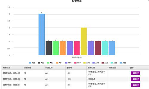 記錄設備一段時間的報警情況,出現(xiàn)故障時,快速定位機器問題,生成對應工單,安排對應負責人進行處理;通過對設備報警的分析,做有針對性的備維修保養(yǎng)計劃和備品備件計劃。